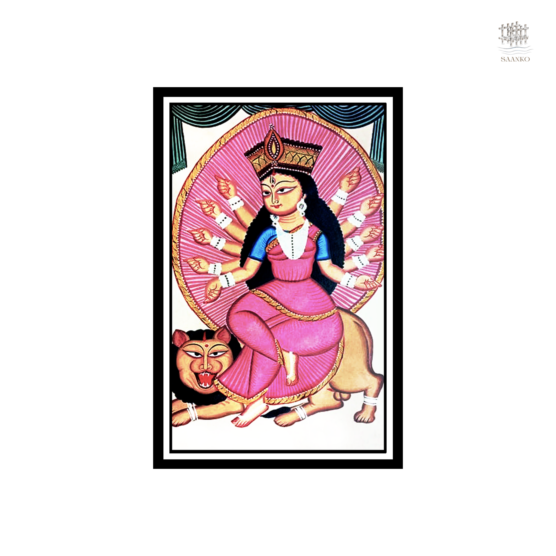In this striking photo-chitra, Maa Durga and her lion are rendered in the flowing lines and bold colors of the Kalighat school of painting, set against a luminous pink backdrop. The softness of the background contrasts with the fierce dynamism of Durga and her vahana, heightening their divine presence.