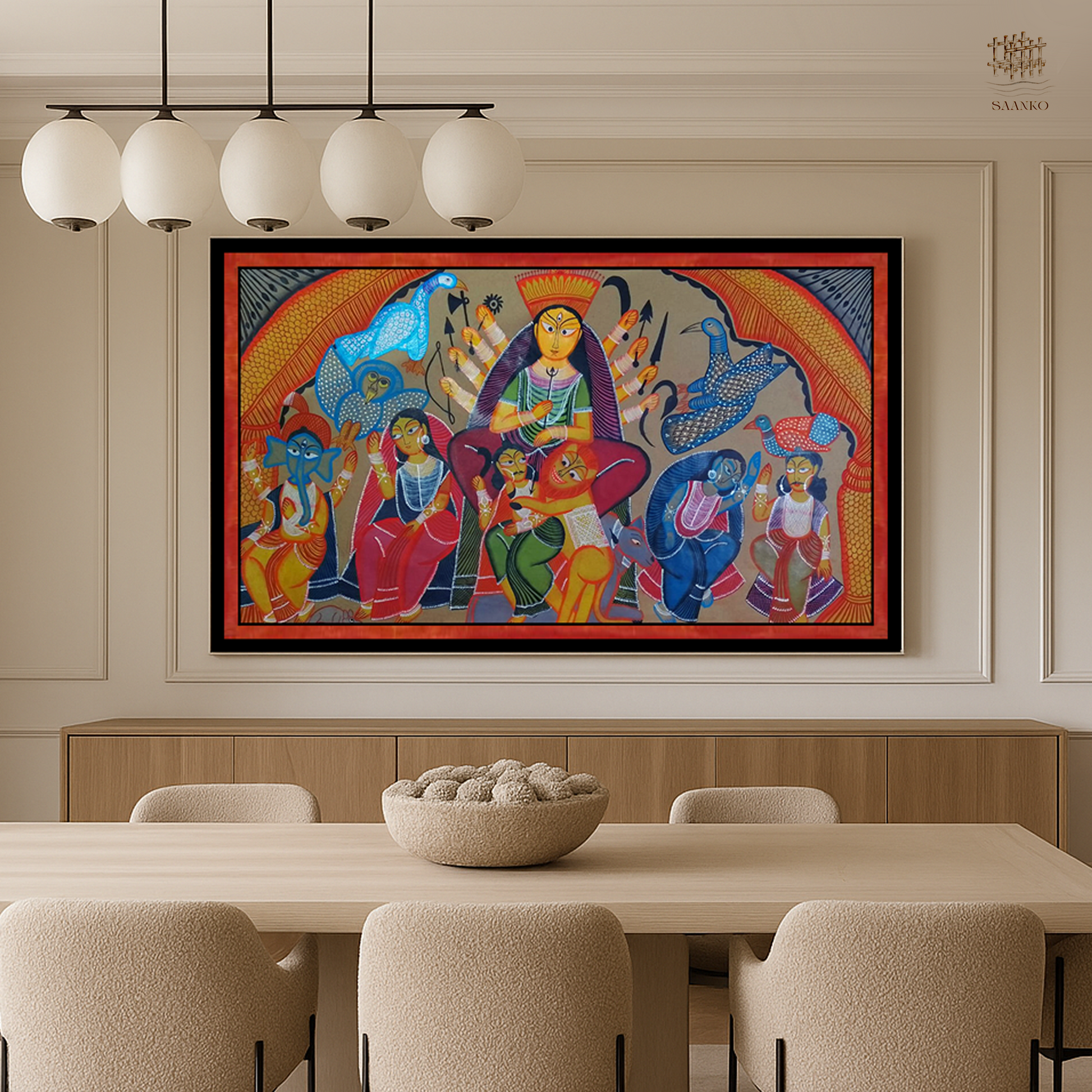 Painted in the Kalighat-inspired Bengal style, the work is marked by bold outlines, sweeping brushwork, and a vivid color palette. The fine detailing of attire, ornaments, and sacred vahanas imbues the painting with devotional richness, while the overall composition reflects both dramatic tension and spiritual serenity. This Patachitra is not only a retelling of myth but also a profound meditation on motherhood, power, and the sustaining harmony of the universe.