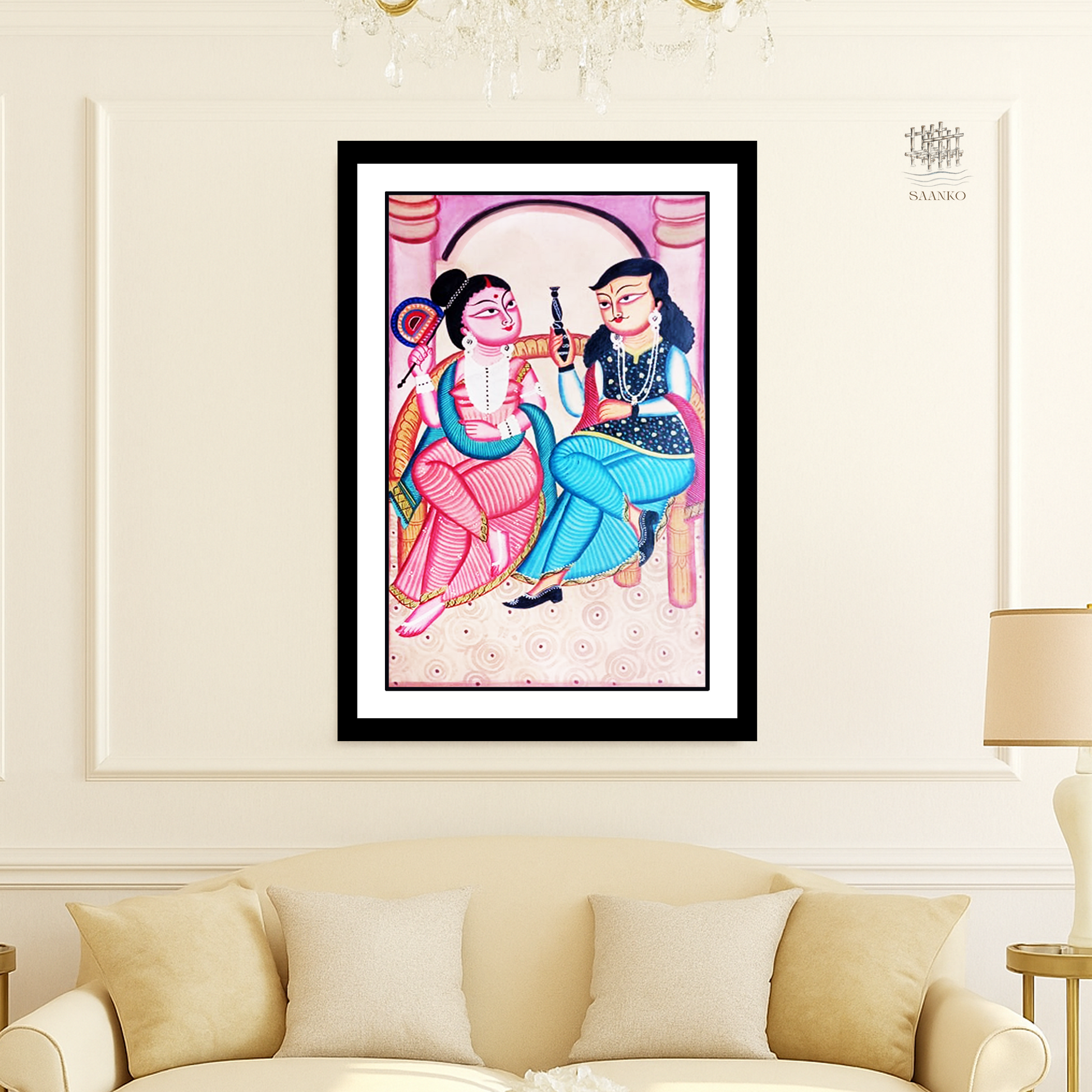 This Kalighat painting belongs to the genre known as Majlish, where artists from 19th-century Calcutta turned their brush toward society itself. Rather than depicting gods and goddesses, these works portrayed men and women in satirical scenes that reflected the changing urban world of the time.