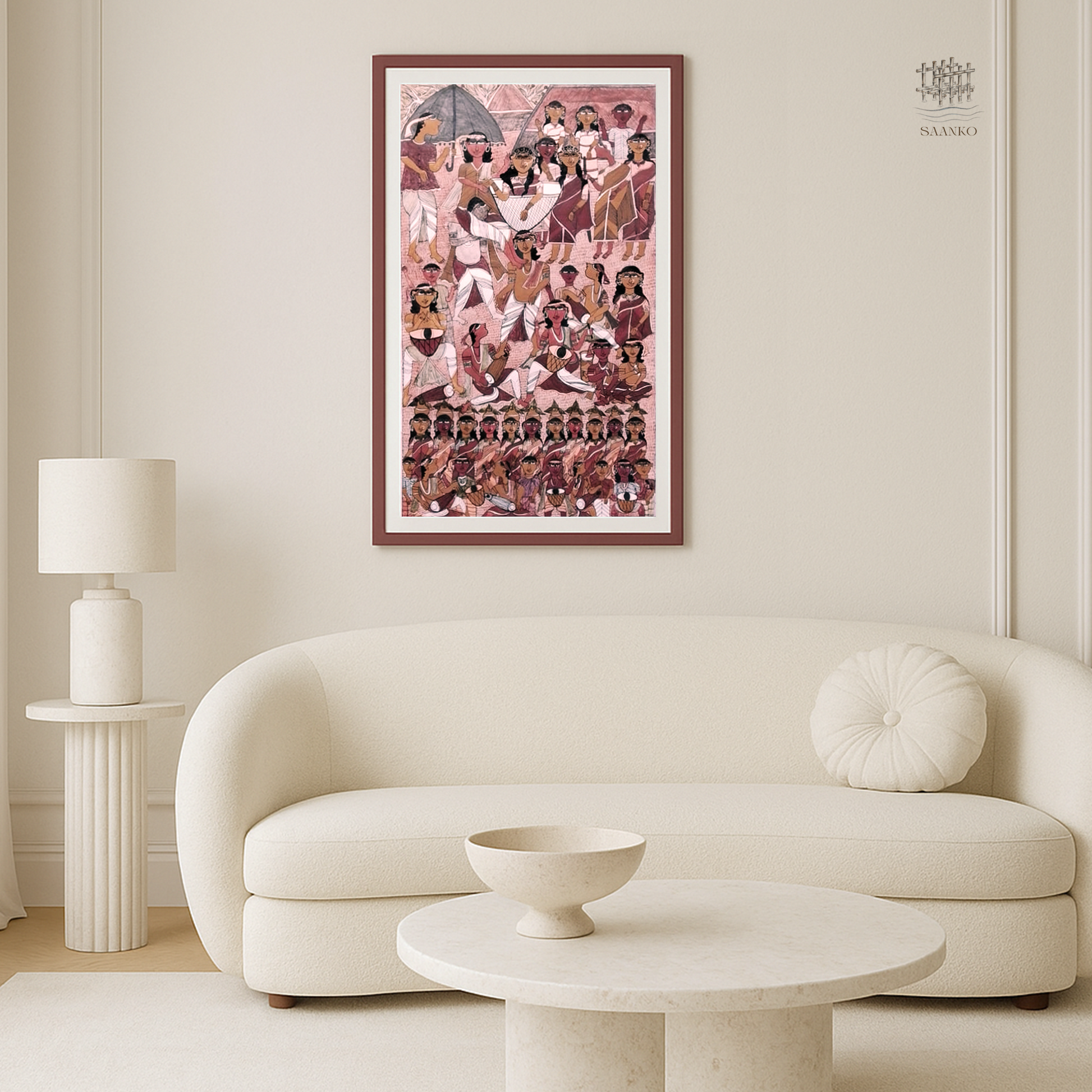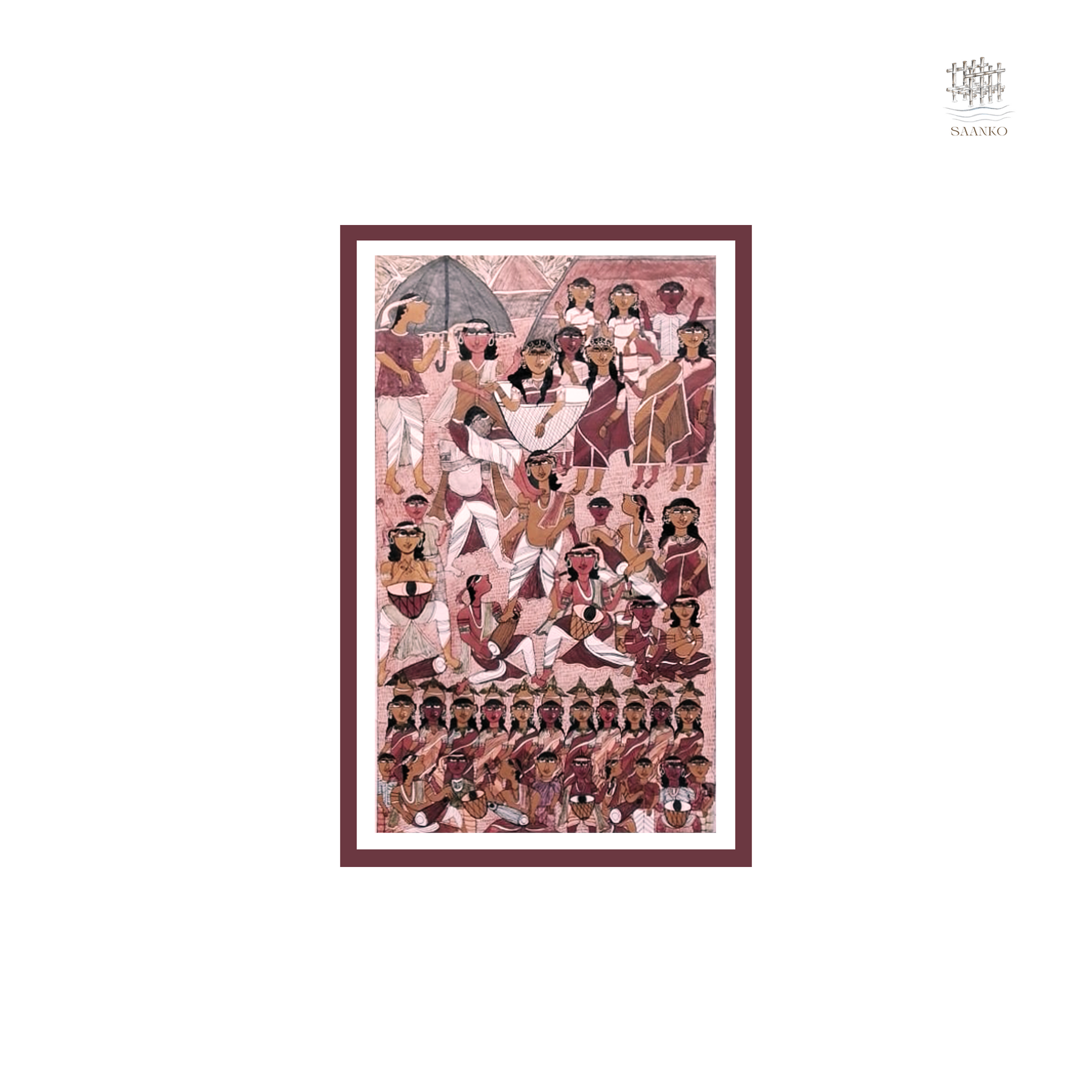 Each figure, draped in earthy reds and whites, carries an instrument, vessel, or gesture that adds to the symphony of collective rhythm. The layered arrangement symbolizes the many voices of the community coming together as one. The earthy tones root the celebration in the soil, while the vibrant energy of the dancers reflects the cycles of harvest, fertility, and renewal.