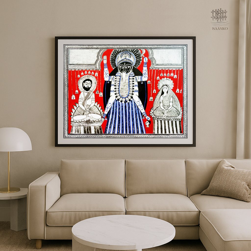The work is not only an object of devotion but also a dialogue between myth and history, divinity and humanity. The Goddess dominates the visual space as the eternal source, while Ramakrishna and Sarada Devi, rendered with delicate reverence, affirm the living continuity of her worship. With its bold lines, natural colors, and sacred iconography, the painting exemplifies the narrative power of a timeless art form that blends storytelling, symbolism, and devotion in one unified vision.